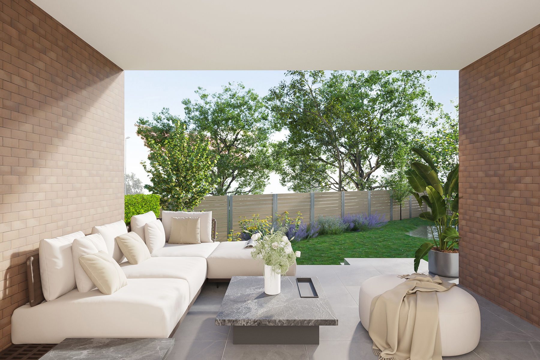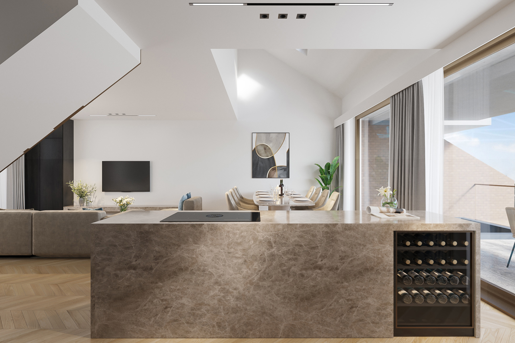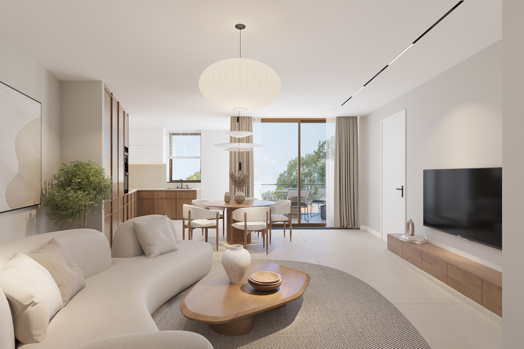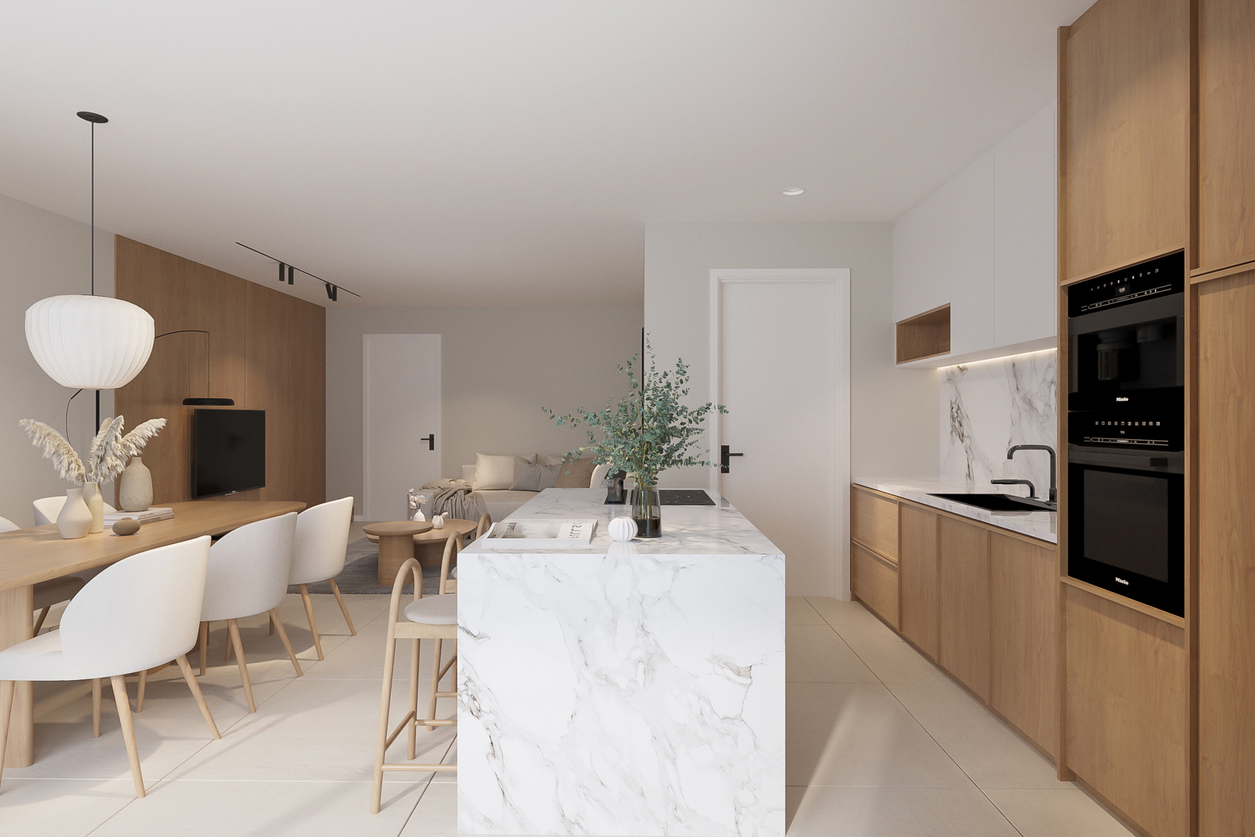 Binnen wordt dezelfde sereniteit doorgetrokken. Elk appartement wordt afgewerkt met hoogwaardige materialen, tijdloze klasse en met de allerlaatste technieken. De royale raampartijen brengen overvloedig daglicht binnen en de ruime terrassen zorgen voor een heerlijk verlengde van de leefruimte.