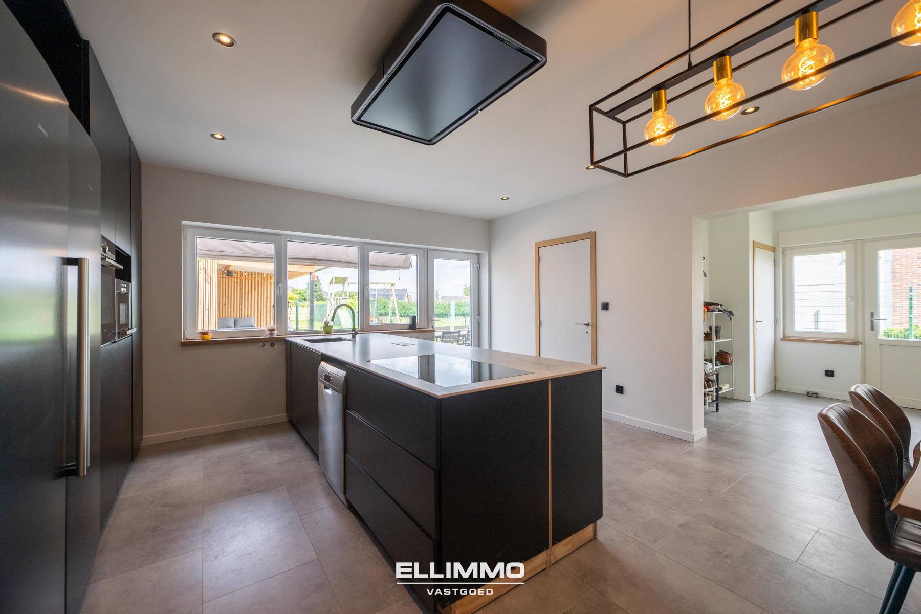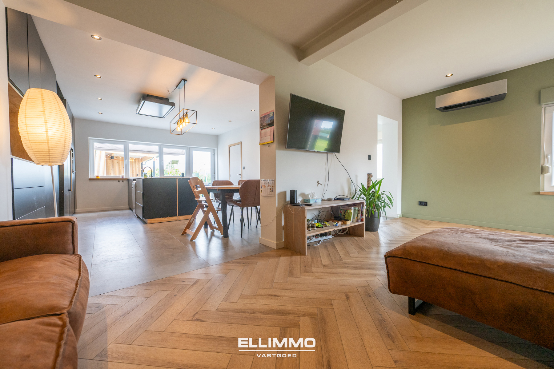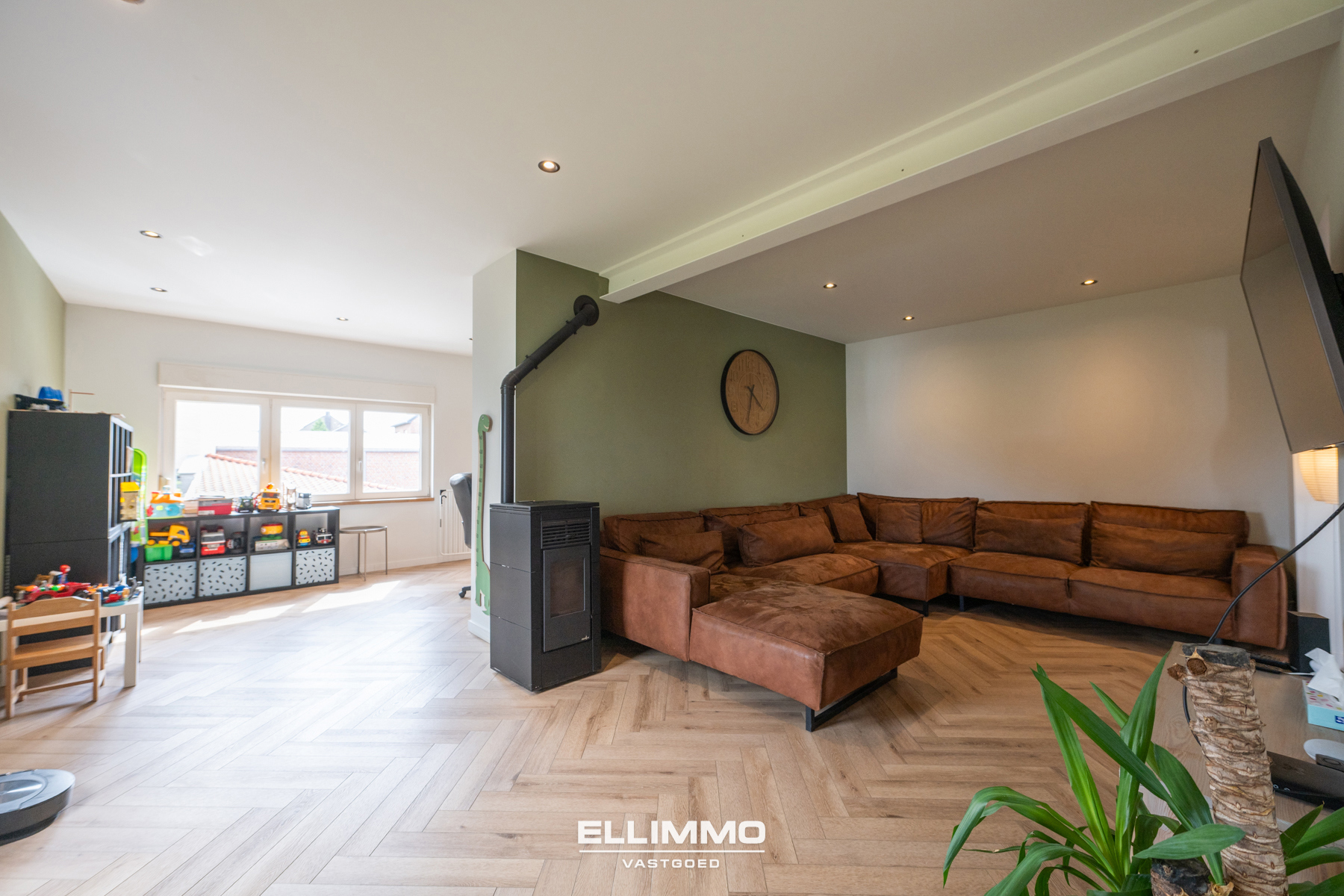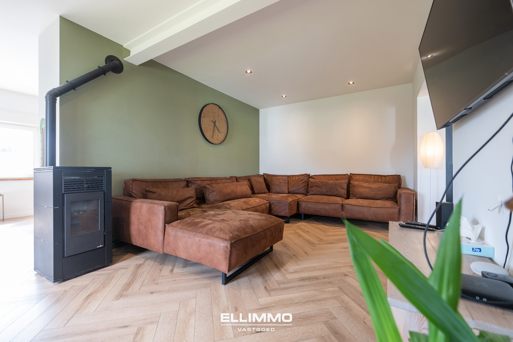 Inkomhal houten schuifdeur naar de ruime leefruimte, ruime leefruimte voorzien van een prachtige visgraatparkettegel met een ruim bureel, zithoek met palletkachel, volledig geïnstalleerde eilandkeuken met aansluitend een extra berging met aansluiting voor een wasmachine, zij inkomhal met gastentoilet en vestiaire. Doorheen de volledige ruimte zijn grote raampartijen waardoor er een zalige lichtinval is.