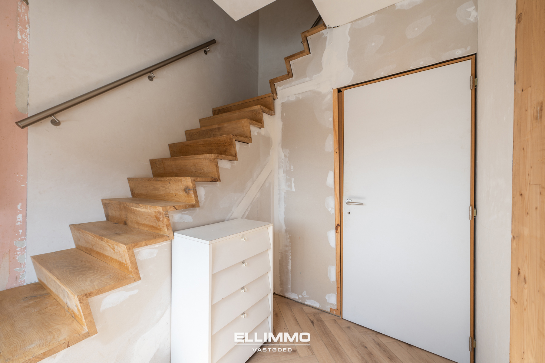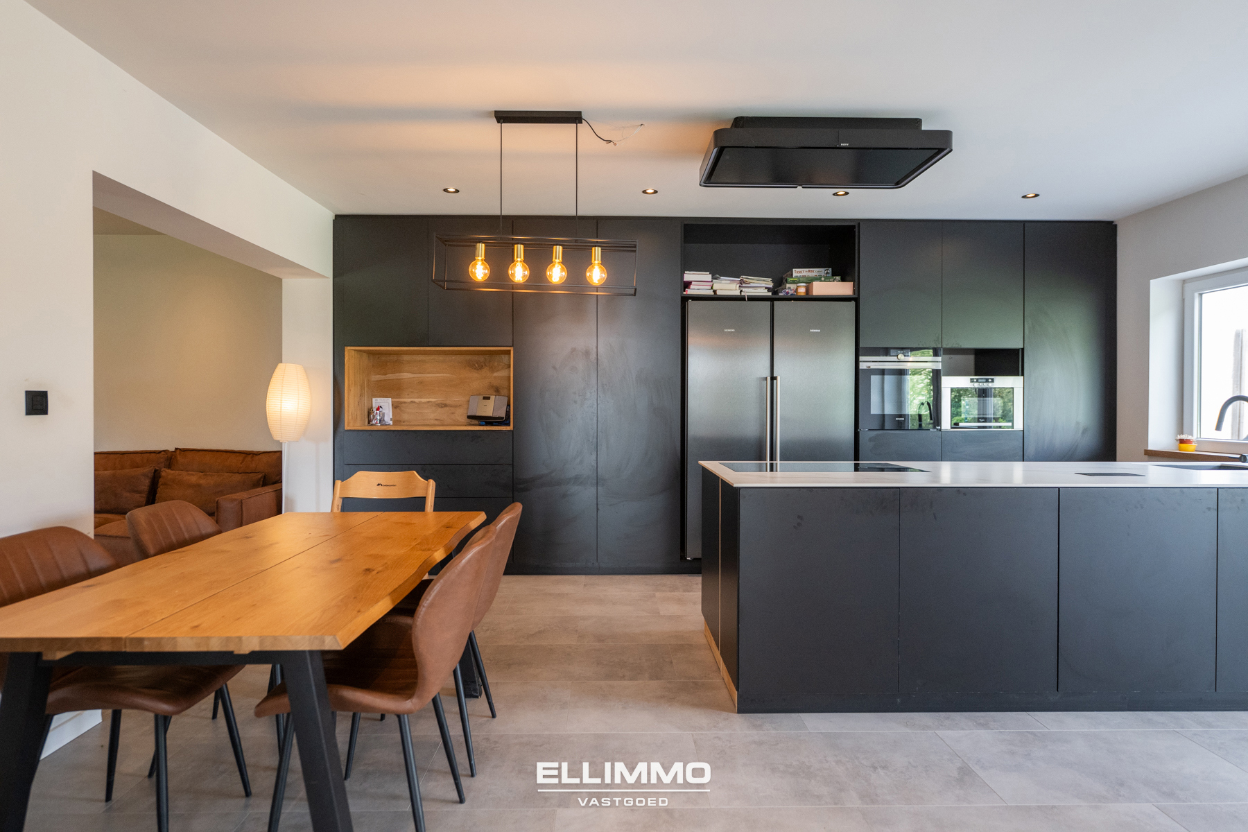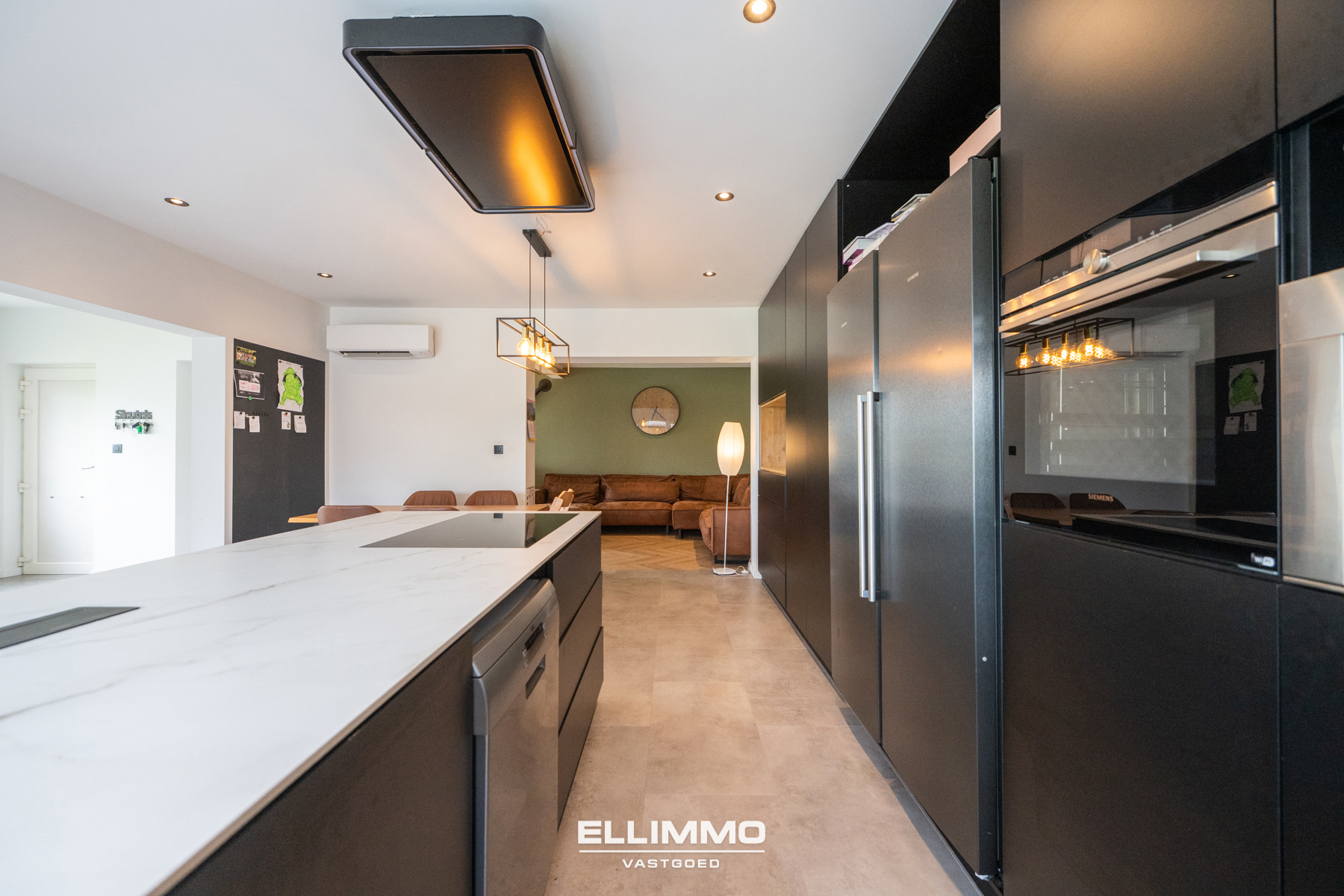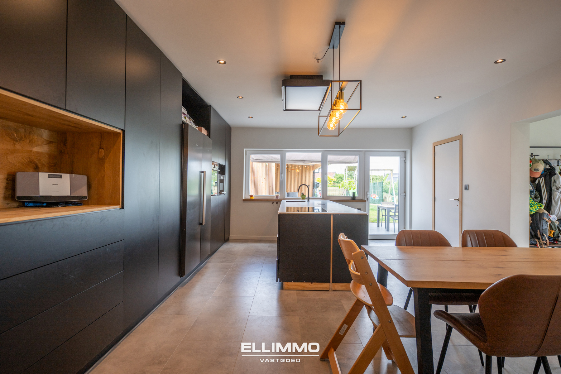 Inkomhal houten schuifdeur naar de ruime leefruimte, ruime leefruimte voorzien van een prachtige visgraatparkettegel met een ruim bureel, zithoek met palletkachel, volledig geïnstalleerde eilandkeuken met aansluitend een extra berging met aansluiting voor een wasmachine, zij inkomhal met gastentoilet en vestiaire. Doorheen de volledige ruimte zijn grote raampartijen waardoor er een zalige lichtinval is.