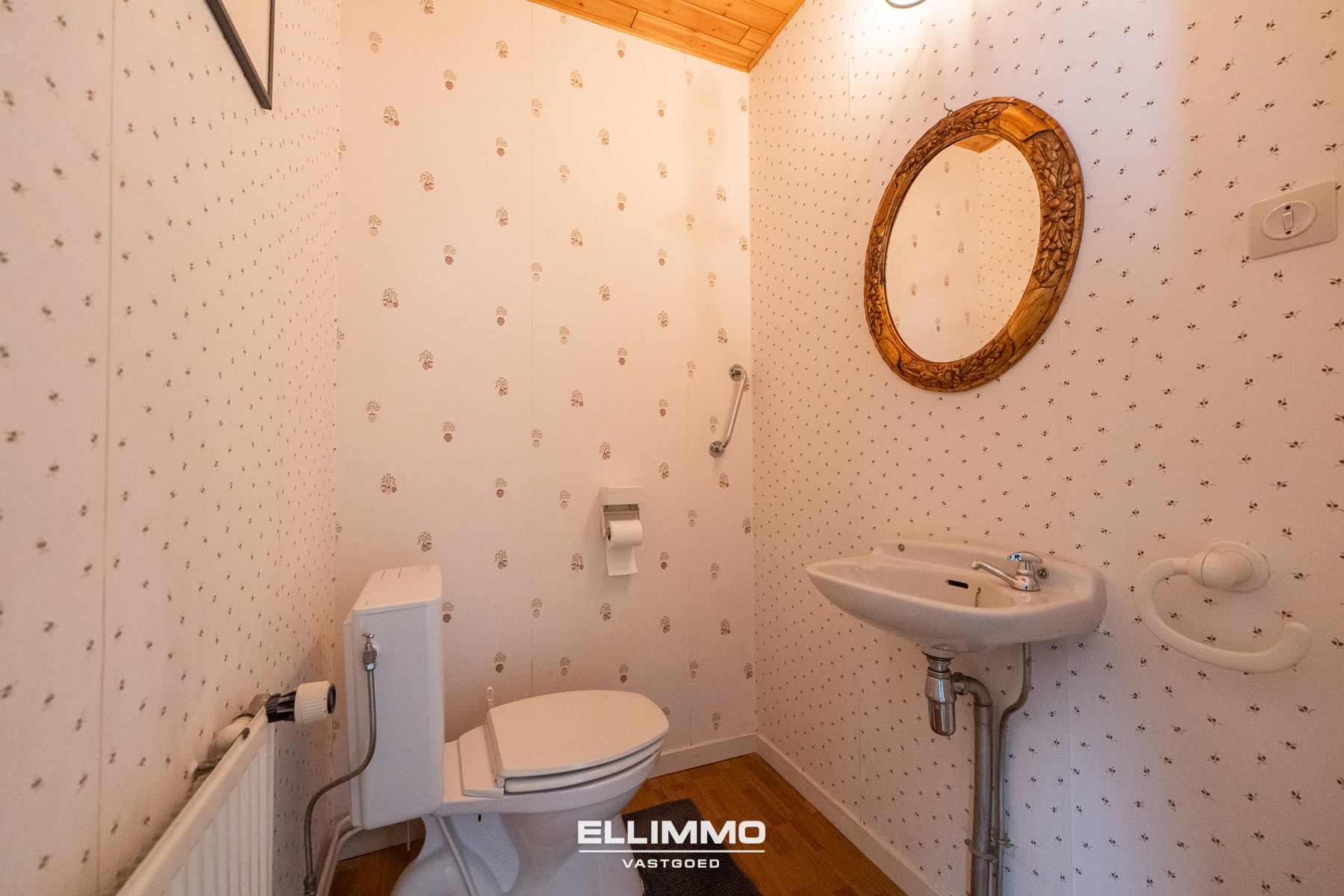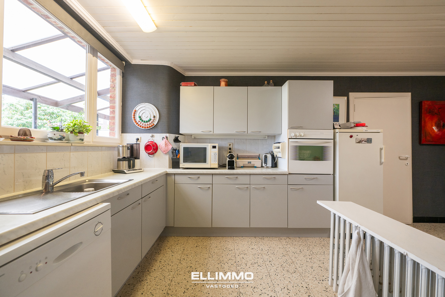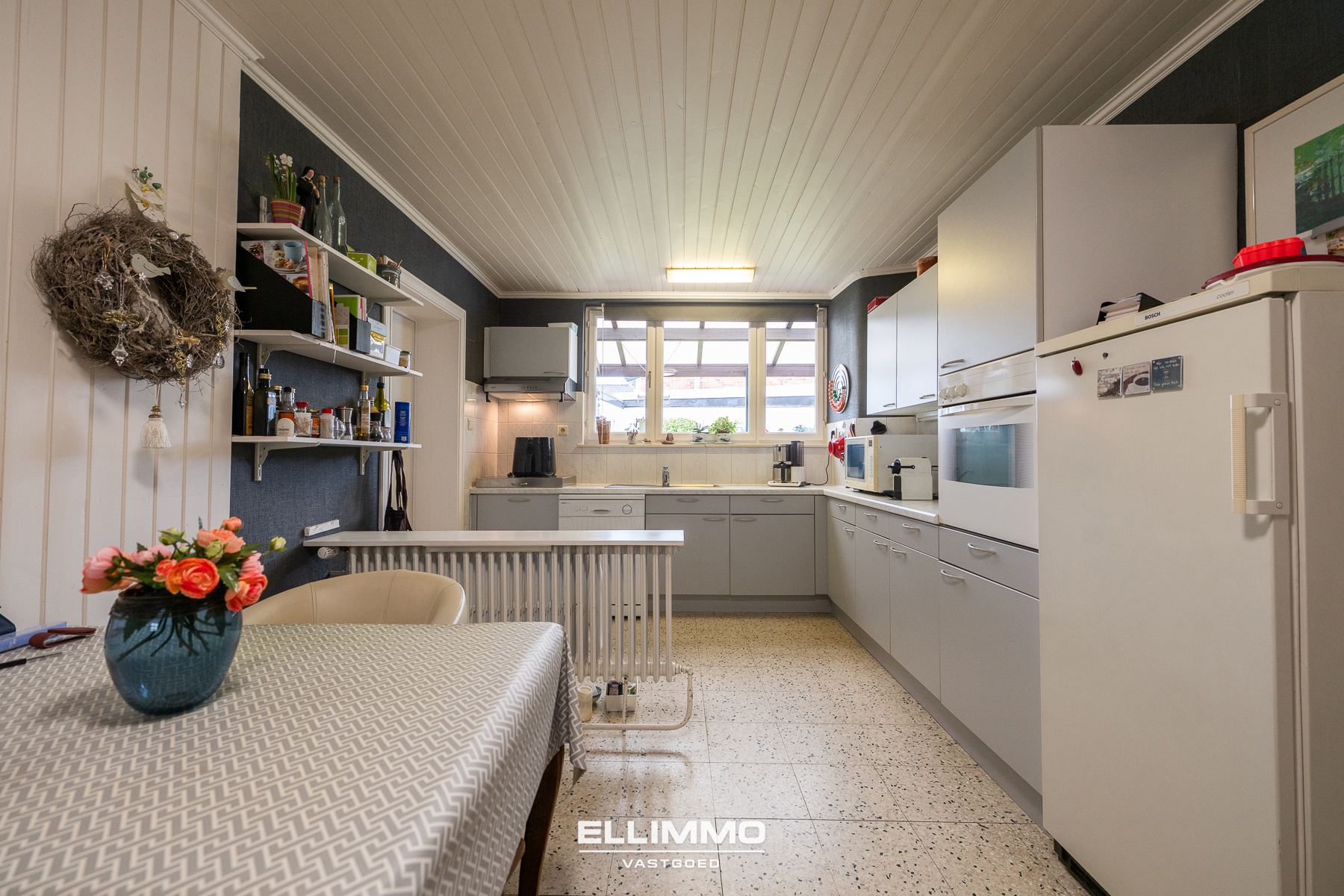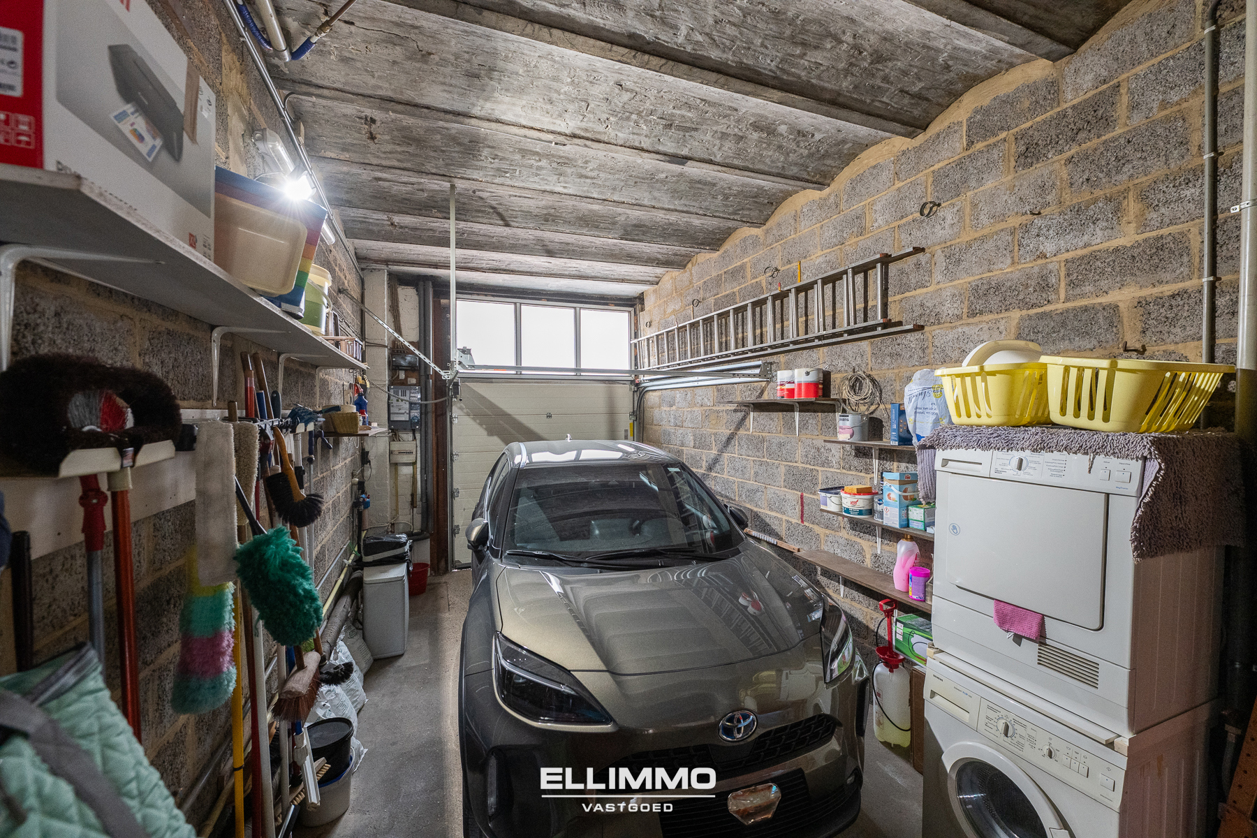 Ruime inkomhal met toegang tot de gezellige zitkuil met houtkachel – ideaal voor knusse winteravonden. Aansluitend bevindt zich de eetkamer met uitzicht op de tuin, en de keuken met toegang tot een praktische berging. Hier vind je ook de vernieuwde badkamer met dubbele lavabo en toilet. Verderop bereik je de inpandige garage.