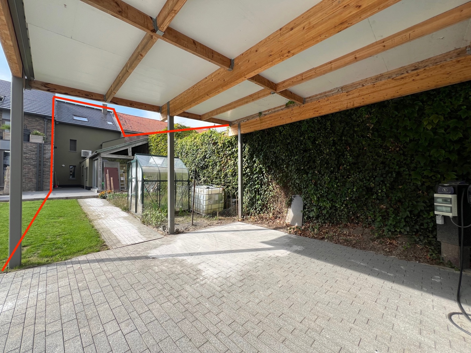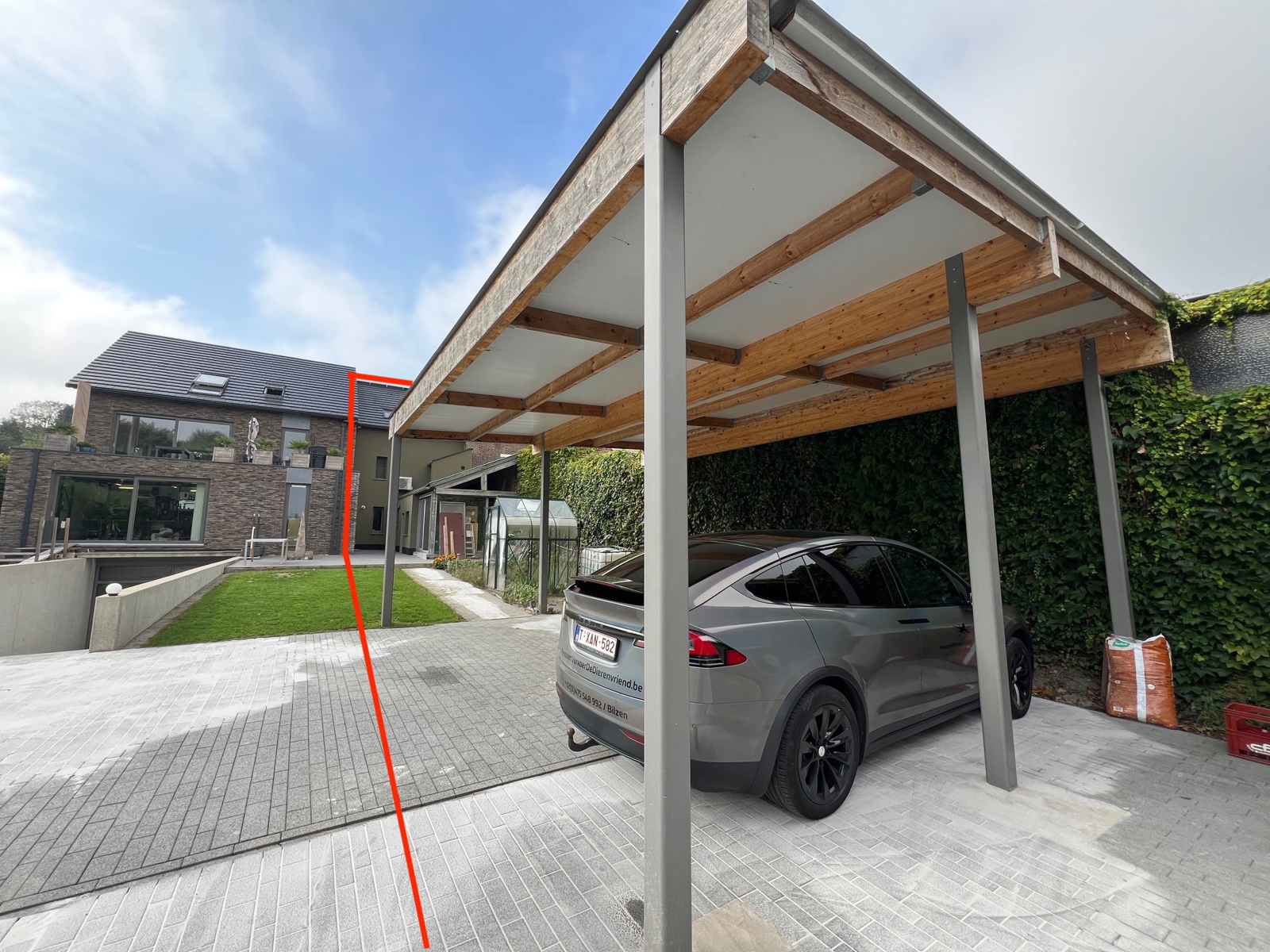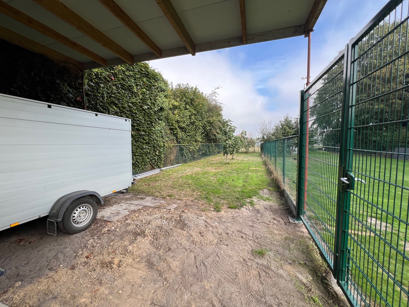 Ook beschikt de woning over een ruime carport voor 2 wagens, een autostandplaats voor de woning én een leuke tuin, nu weide, bereikbaar via de zijkant van de blok. De achterkant is bereikbaar via een gemeenschappelijke elektrische poort, zo staan de wagens altijd veilig achter de woning.