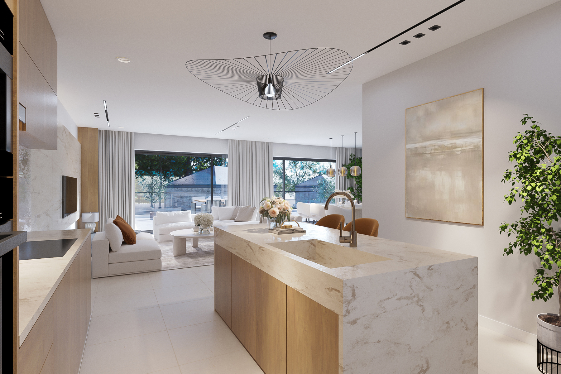 Grote terrassen worden een verlengde van de woonkamer, omgeven door een prachtige aangelegde tuin die het geheel een serene uitstraling geeft. Binnen gaat verfijning hand in hand met ultiem comfort; luxueuze afwerkingen met een keukenbudget van € 25.000 - en een badkamerbuget van € 8.000 - zorgen voor pure verwennerij.