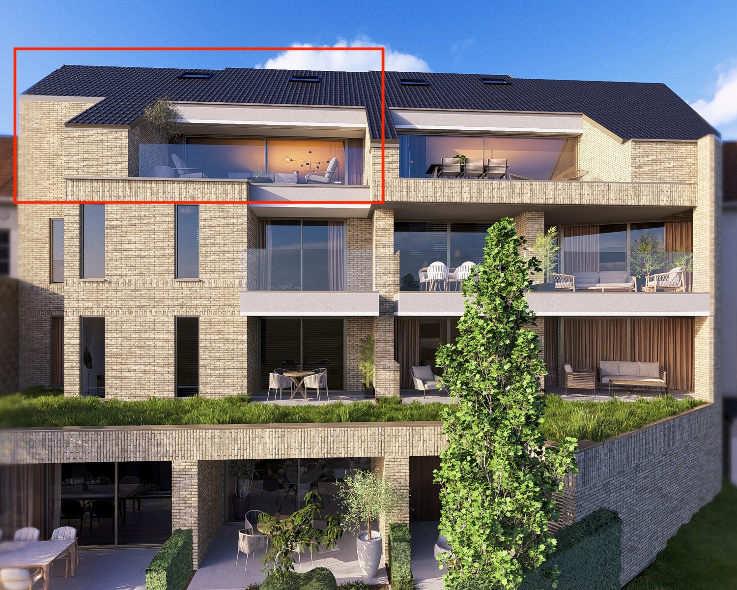 Binnen wordt dezelfde sereniteit doorgetrokken. Elk appartement wordt afgewerkt met hoogwaardige materialen, tijdloze klasse en met de allerlaatste technieken. De royale raampartijen brengen overvloedig daglicht binnen en de ruime terrassen zorgen voor een heerlijk verlengde van de leefruimte.