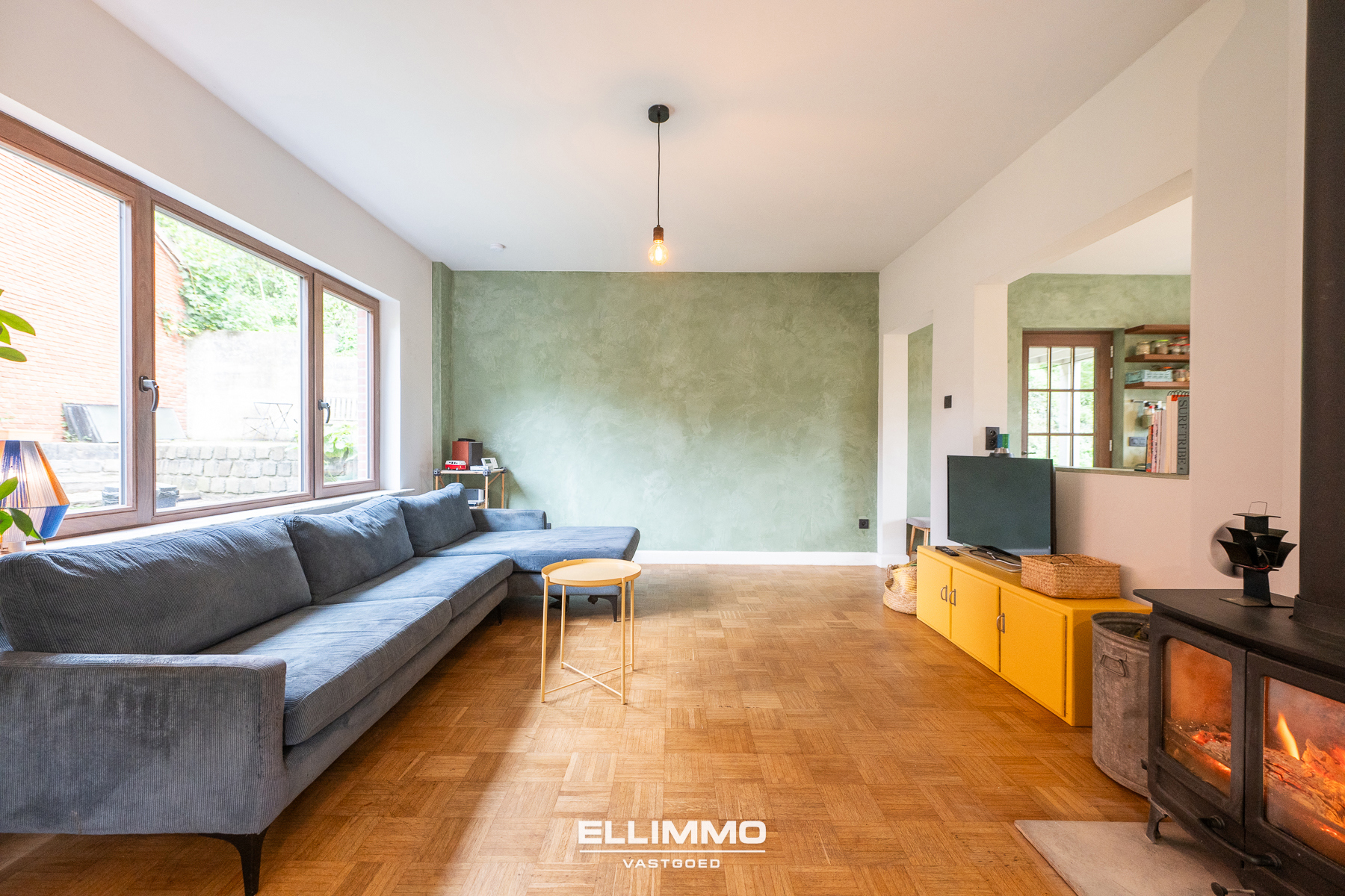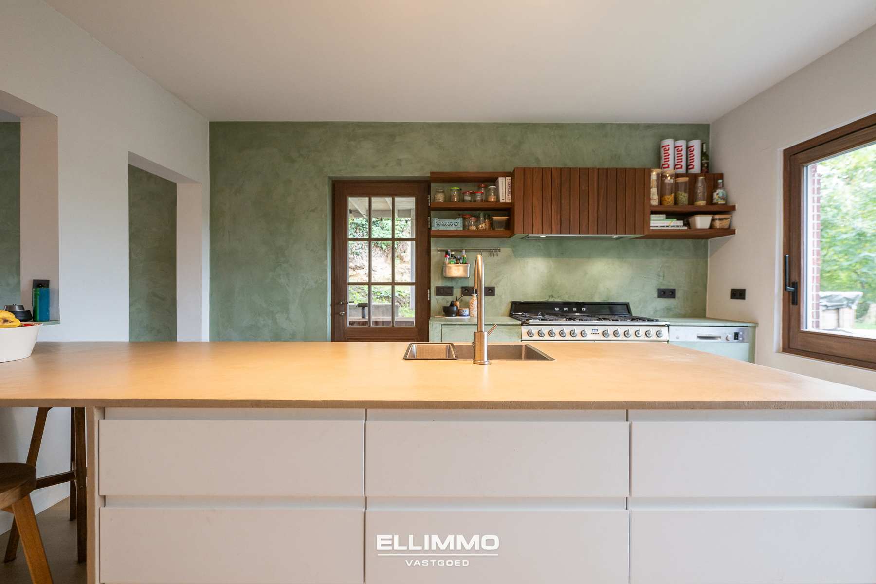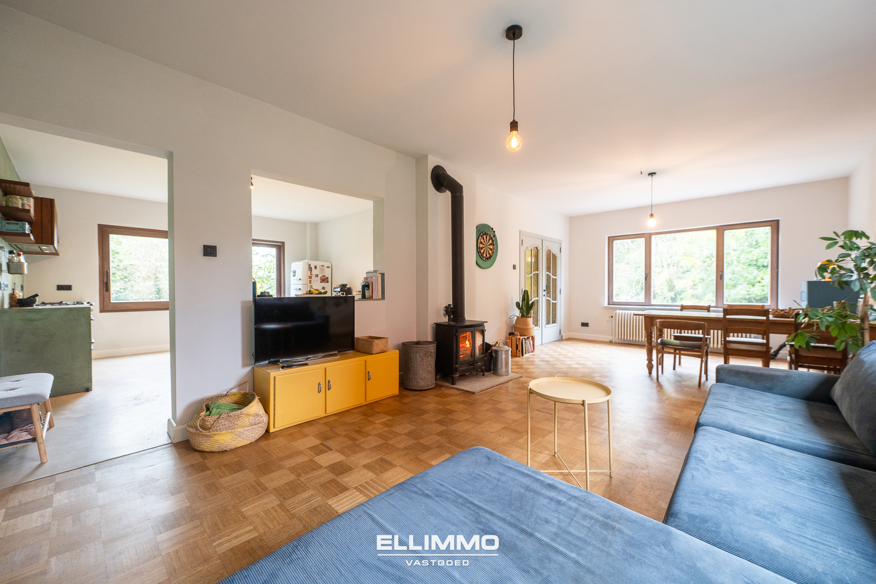 Ruime inkomhal met de authentieke vloer en marmeren trap, dubbele houten glazen deur naar de leefruimte, zalige leefruimte met een gezellige houtkachel, volledig vernieuwde eilandkeuken met een stijlvol Smeg fornuis, doorheen de leefruimte en de keuken zijn er veel raampartijen waardoor er een heerlijke lichtinval is én een prachtig uitzicht op het groen rondom de woning.