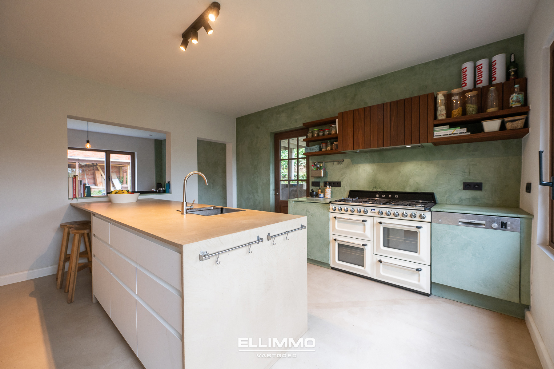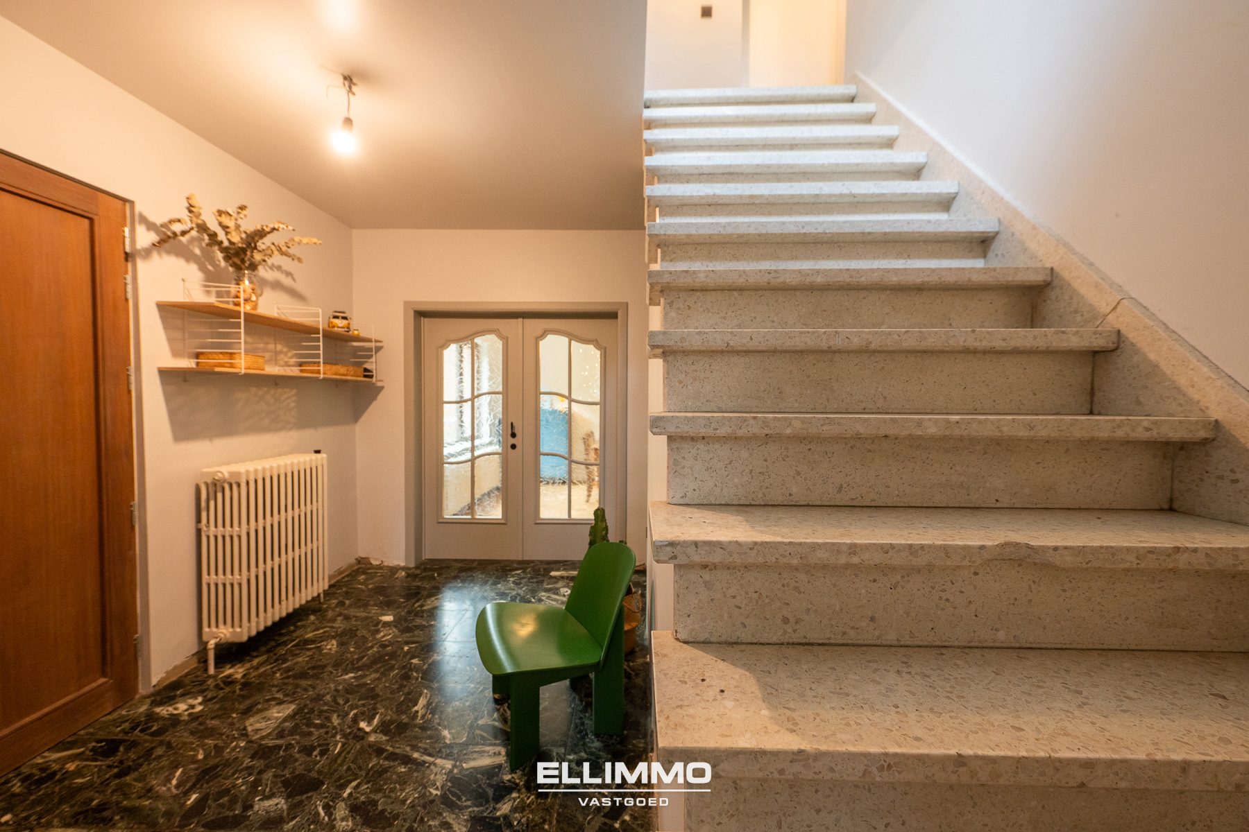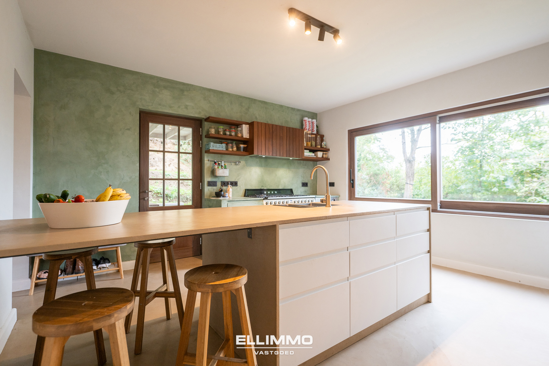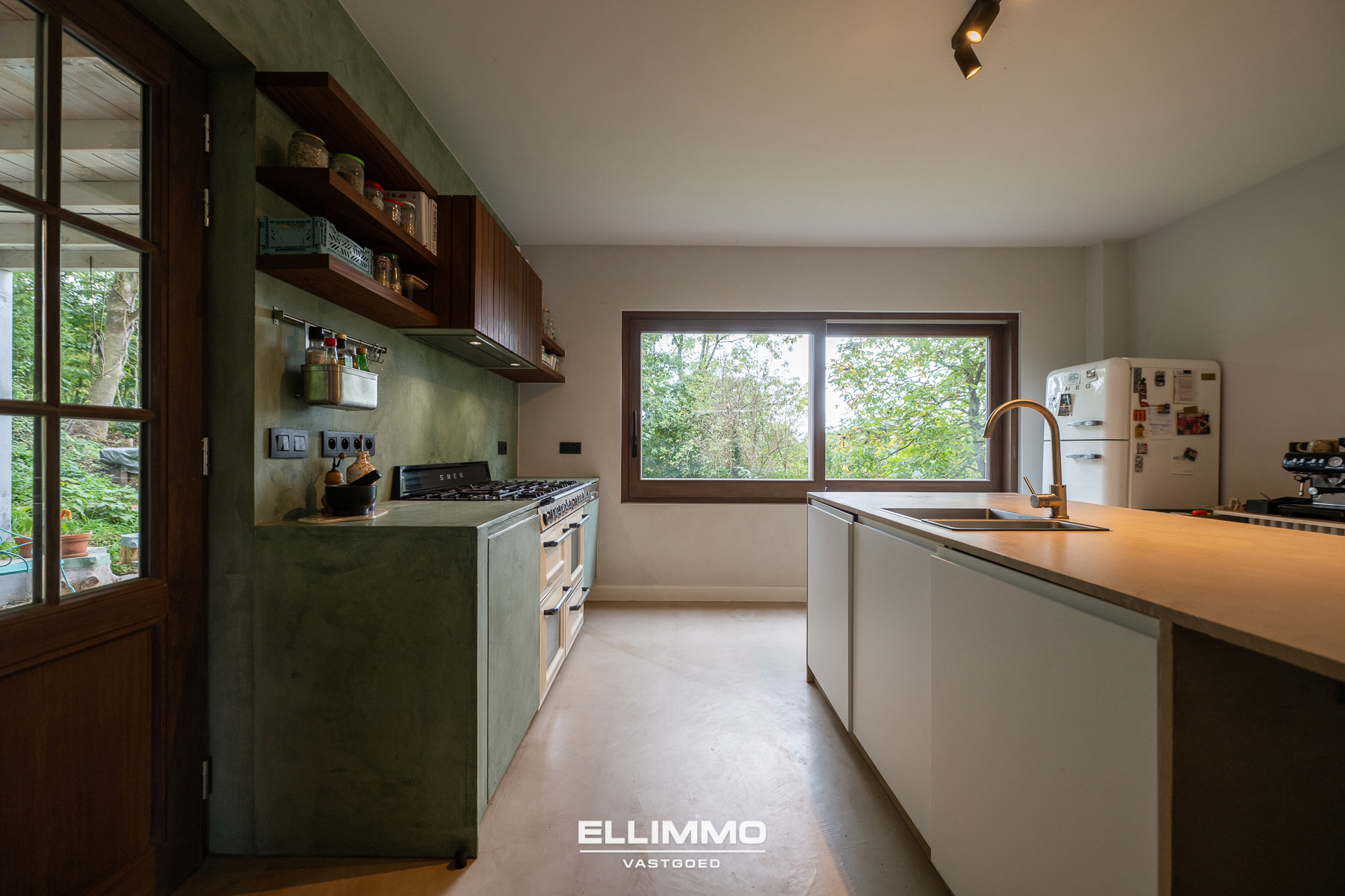 Ruime inkomhal met de authentieke vloer en marmeren trap, dubbele houten glazen deur naar de leefruimte, zalige leefruimte met een gezellige houtkachel, volledig vernieuwde eilandkeuken met een stijlvol Smeg fornuis, doorheen de leefruimte en de keuken zijn er veel raampartijen waardoor er een heerlijke lichtinval is én een prachtig uitzicht op het groen rondom de woning.