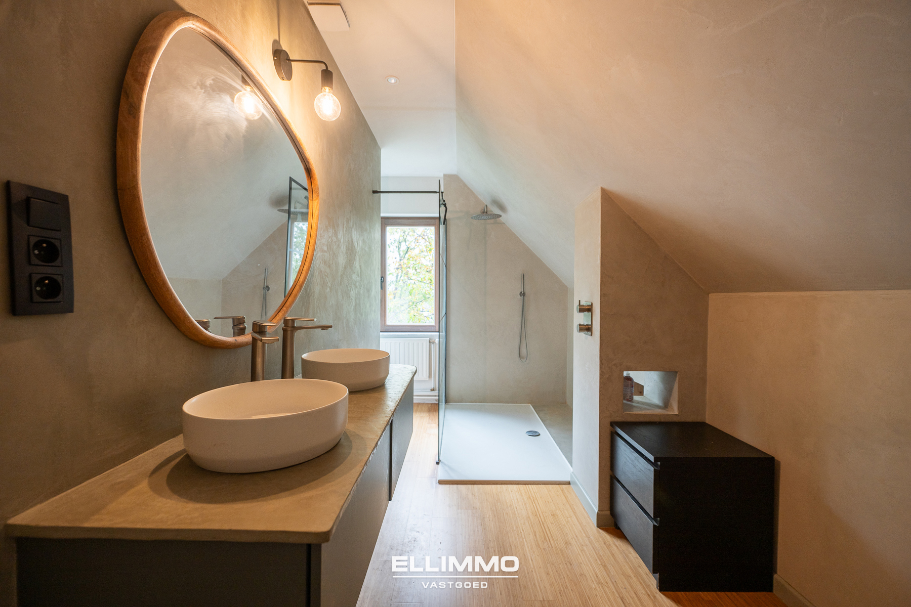 Nachthal met toegang naar de 3 ruime slaapkamers, badkamer uitgerust met een inloopdouche, dubbele lavabo met meubel en toilet.